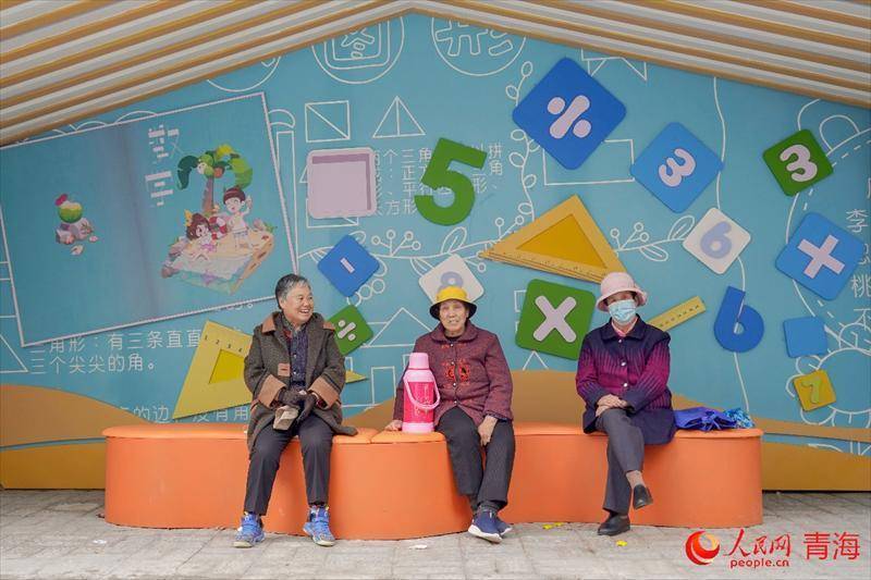 老街居民三五为伴,在彩绘墙下休憩闲谈。 实习生 孟啟昇摄