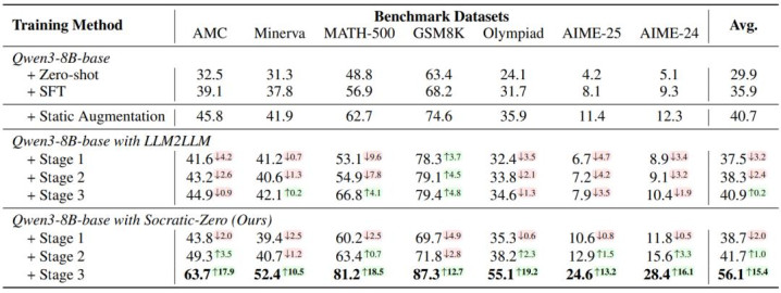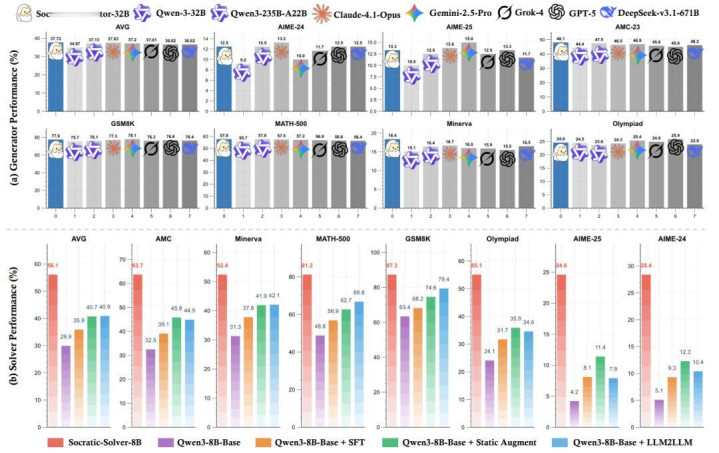 在 7 个数学推理基准(AMC23、AIME24/25、Olympiad、MATH-500、Minerva、GSM8K)上,Socratic-Solver-8B(基于 Qwen3-8B)平均准确率达 56.1%,相比 MetaMath 和 WizardMath(平均 40.7%),绝对提升 +15.4 个百分点;相比 LLM2LLM 提升 +15.2 个百分点。