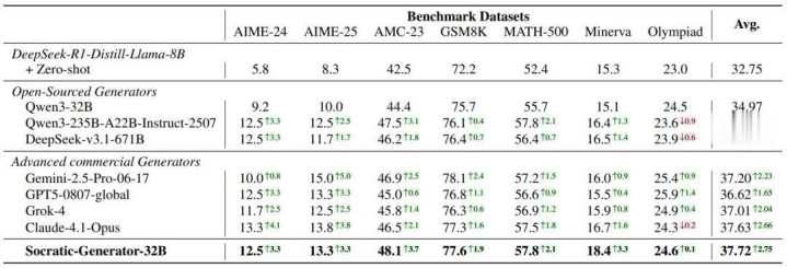 关键结论:仅用 100 个种子问题启动的 Socratic-Generator-32B,其合成数据质量已超越 GPT-5、Gemini-2.5-Pro 等闭源大模型作为数据生成器时的表现。
