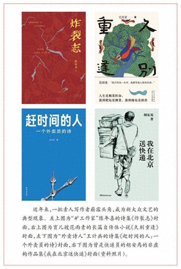 王计兵:素人写作其实一直存在,比如一些文学大家,他们在成名之前,很多都是素人。我们今天所说的素人写作,大多是指在网络环境下展现出来的普通人的写作现象。比如矿工、商贩、出租车司机、外卖员,他们都是广大人群中普普通通的一员,却因写作被甄别出来。素人写作因为更加贴近大众生活,容易被读者接纳。就像我曾在笔记里写过的感受:“我们终因普通而不凡。”素人写作的特质,在于大多有浓郁的情感与真实的生活。以我自身为例,我既是“外卖骑手”中的一员,也是“外卖骑手”的观察者。我会观察他们的日常、他们的语言表达,并整理成作品。去年,我出版诗集《低处飞行》,选“飞行”这个词是因为联想到我们的工作状态几乎都是贴地“飞行”,想传递的生活态度就是:我们有“翅膀”,无论所处位置高低,只要我们愿意,每个人都可以“飞行”。当然,素人写作者走进大众视野后,应该更加努力,不能让“素人写作”的标签拉低了新大众文艺的高度。